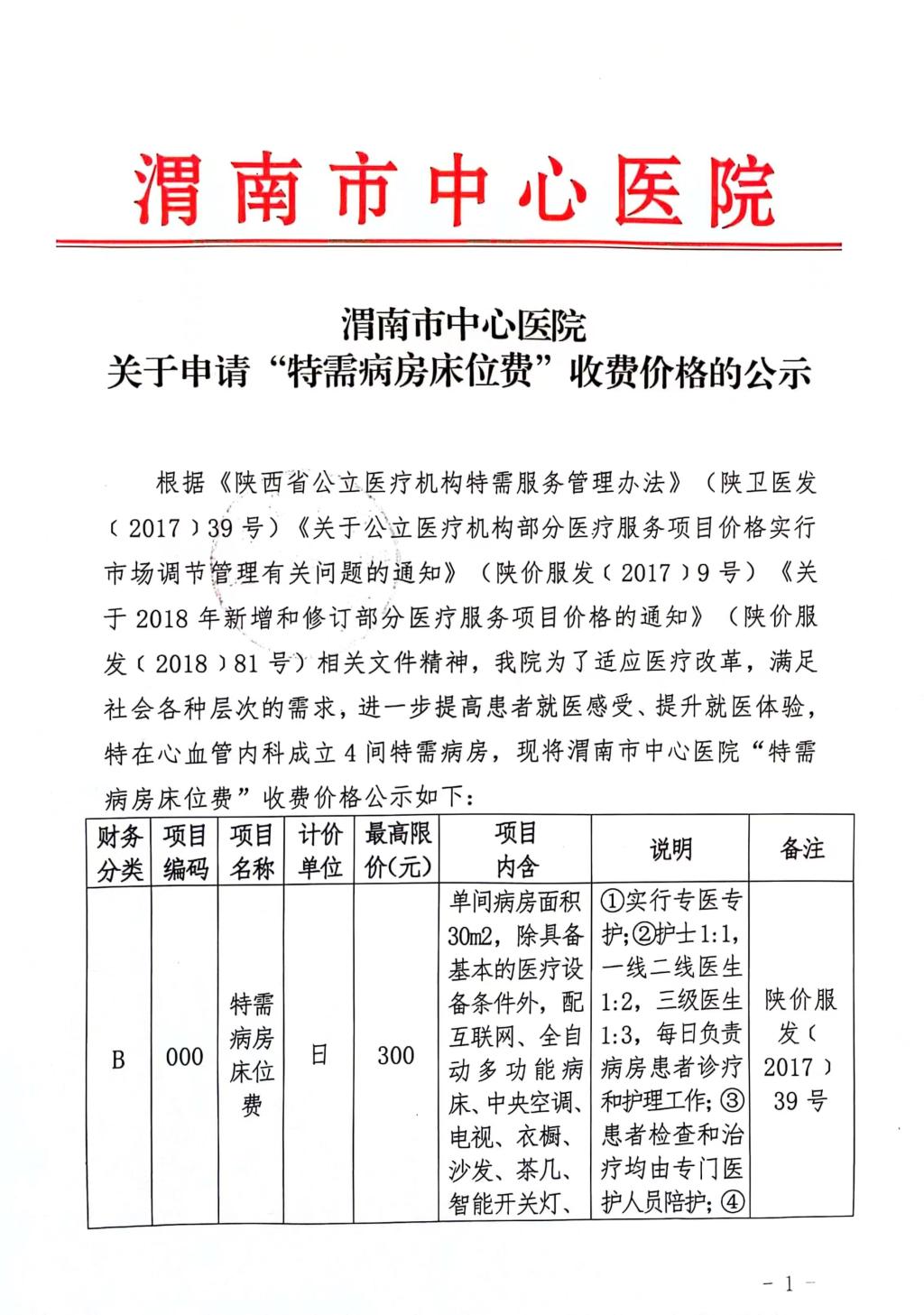 江南在线体育关于申请“特需病房床位费”收费价格的公示