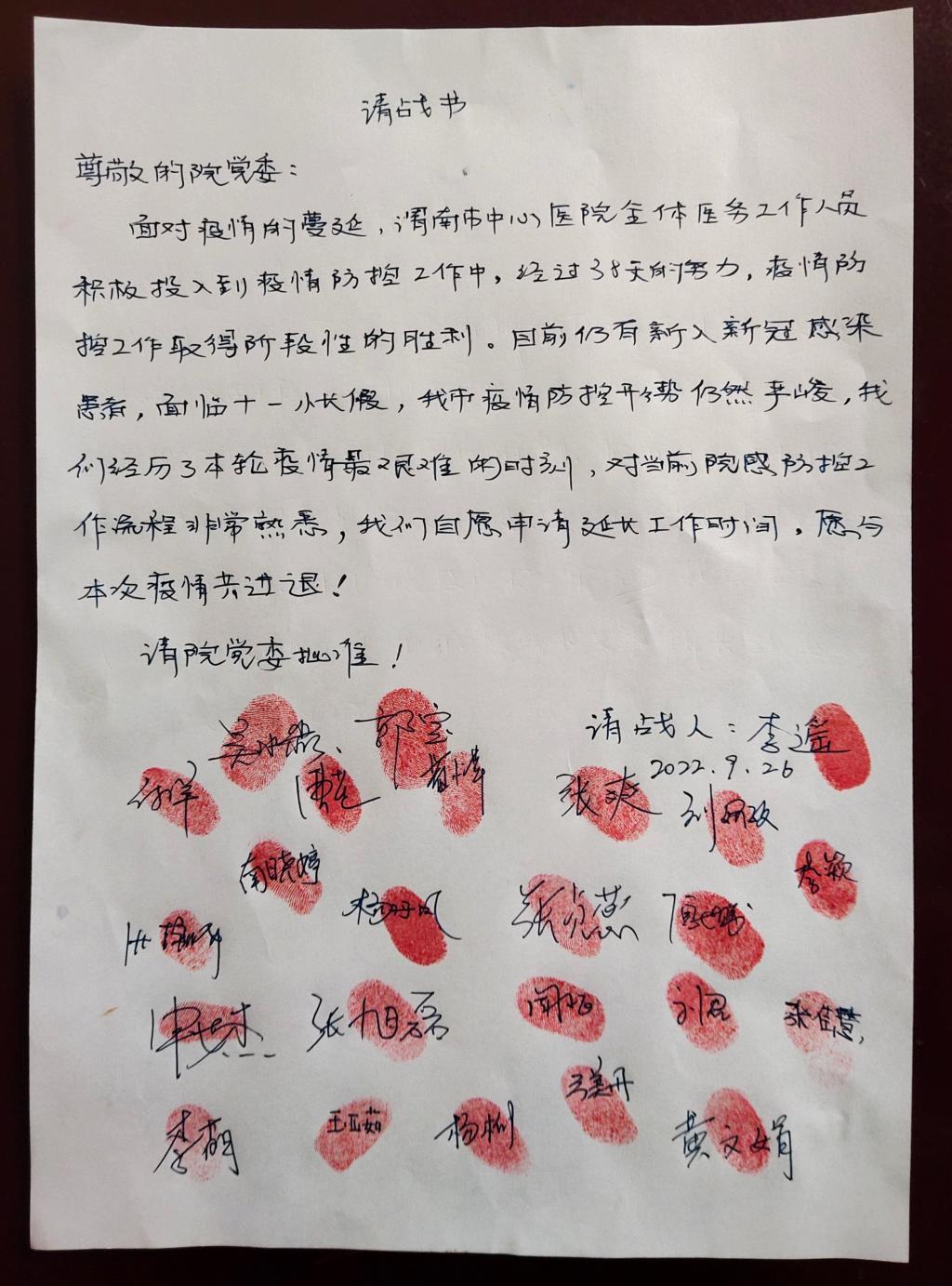 自疫情开始,这些医护人员夜以继日奋战在定点医院,在病员减少、医院准备替换他们情况下,担忧长假将至疫情反扑、形势复杂,纷纷请战要求继续“战斗”,坚守到最后一刻。请战书上,24名“白衣战士”按下了鲜红的手印。