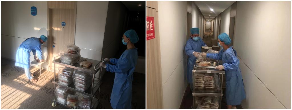 核医学科穆芬、审计科郭瑾每日负责盘点酒店防护和生活物资,做到登记造册、实时清点、及时申领、按需分发,保障物资充足;每日规范组织集中核酸采样、物表采样,对隔离人员上门核酸采样,每日做好所有人员健康监测,发现异常情况及时做好处置;统计所有医护人员一日三餐预定情况,并及时将三餐配送至医护人员房间门口指定位置,为6点早班医护人员预定、分发爱心早餐。同时,定期向医护人员征集用餐问题及建议,及时反馈院工会进行解决,确保闭环酒店医护人员的饮食安全、卫生、营养。