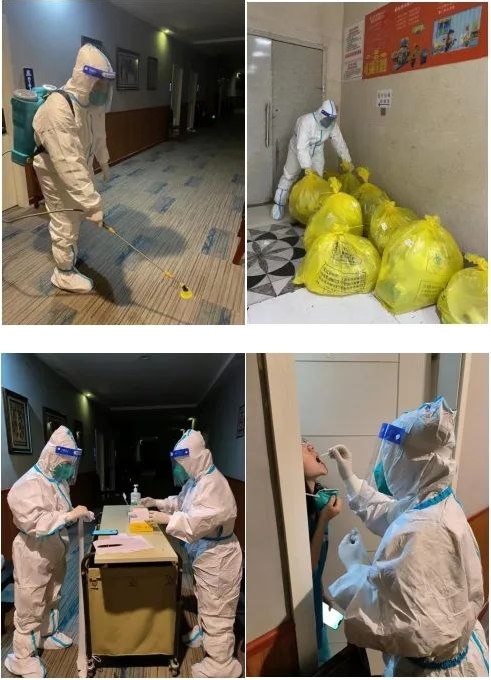 “我每天早上核酸做完后就立即换上防护服对酒店里每一个房间门口的垃圾袋进行收集、鹅颈式封口结扎,转运至一楼进行称重、登记,等待医废转运车抵达酒店门口并协助转运、交接、登记完毕后。紧接着进行酒店全面消杀工作,每次脱下防护服时,里面的衣服早已被汗水浸透......”杨耀东同志在经过连续四天的辛勤奋战后,不禁感慨:其实真正辛苦的并不是跑跑腿、出出汗的我们,而是又要即将奔赴一线,日夜奋战的医护人员,平时没有机会直接关怀他(她)们,在这段特殊时光,我们定要竭尽所能,做好后勤保障,做白衣战士们的“勤务兵”和“守门人”。