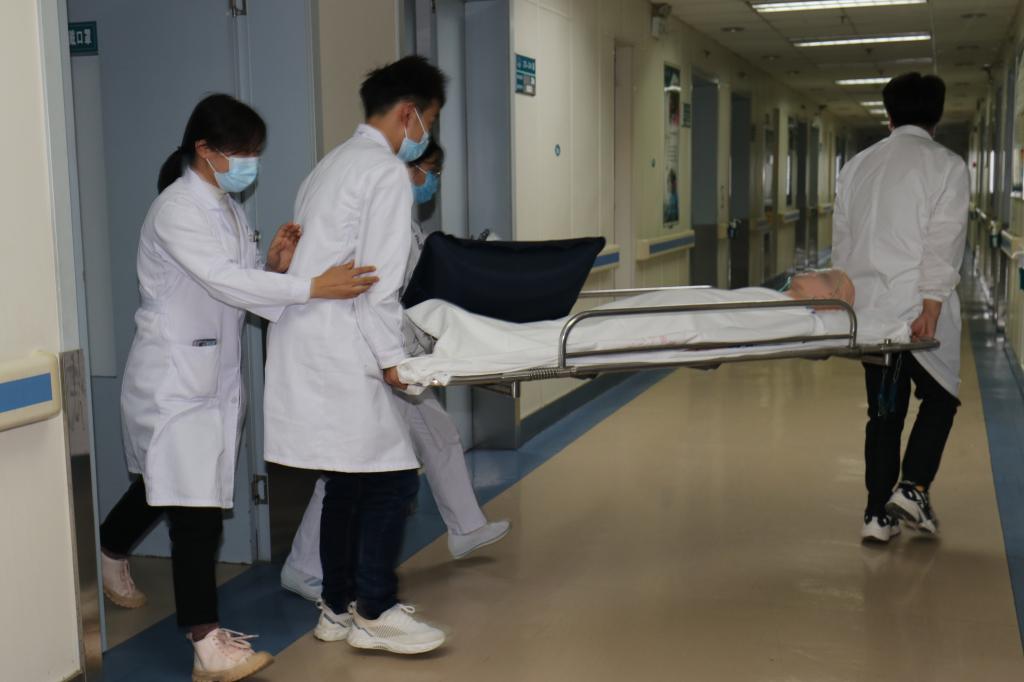 听到警报声后,14楼及联动楼层13、15层共6个病区同时按照应急预案开展初期火灾的扑救、火灾报警以及人员疏散。微型消防站队员第一时间通过消防控制柜发现14楼中医科发生“火灾”,全体队员迅速穿戴消防装备,乘坐消防电梯奔赴着火楼层。