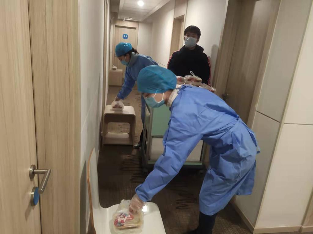 除了以上工作外,确保疫情防控一线闭环人员的生活所需是保障组重要工作。由于医务人员经常加班加点,每日三餐时间无法固定,为了使医务人员在第一时间吃上热乎饭,保障组需反复沟通确认,从登记、准备、到挨个分发,每一个环节都细致入微。饭菜是否可口,有什么特别要求,保障组随时沟通,尽心尽责暖心服务于每一个人。“每天三餐无限循环着,连做梦都在统计吃饭人数和送饭菜”,后勤保障人员贠妮笑着说。