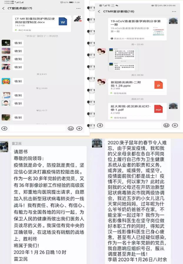面对严峻的疫情,科室成员更是积极响应组织号召,党员同志纷纷挺身而出,以雷卫民副主任及李萌、田果、梁昱栋等为代表,纷纷写下发自肺腑、真诚感人的“请战书”,不计个人得失,服从组织调配。