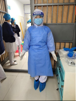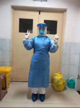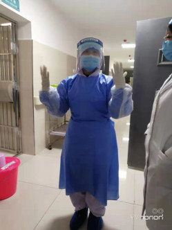 汗水随着隔离衣往下流,尤其是做治疗和其他操作,带着护目镜和面屏、两层手套,只要和病人沟通,护目镜和面屏上满满的都是气,给采血气、抽血和输液增加难度。但我很庆幸,一天八九个血气和抽血项目,、输液都是一针见血,受到患者的表扬和同事的称赞。