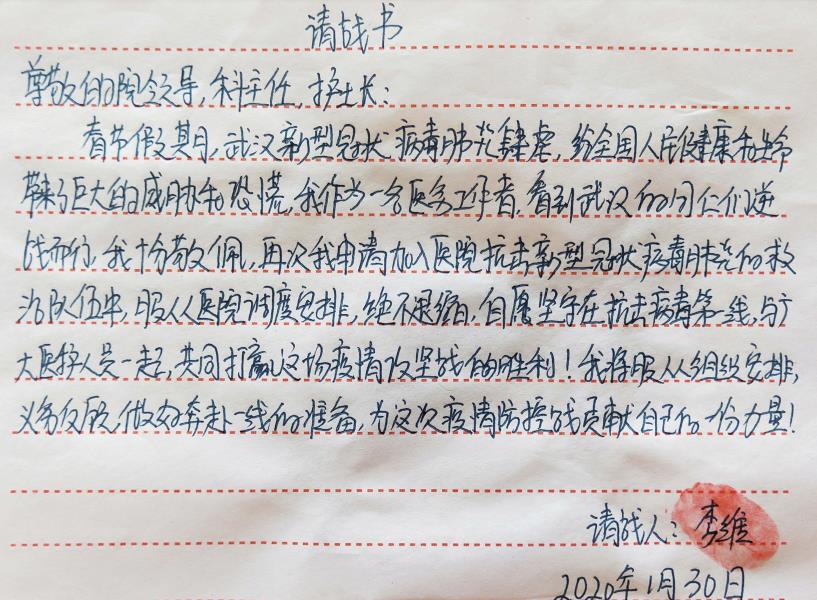 2月10日,护士李维抽调去了感染科。护士长打电话通知她时,她没有丝毫的迟疑。她说:“家里人都很理解并支持我的工作,我可以全身心投入到这次战役当中,我定将不负期望,战胜病毒,胜利凯旋。”早在之前她就写下了请战书,时刻准备着!护士长询问她工作情况时,她说:“穿上防护服的我是一名钢铁战士,我要照顾好每一位患者,让他们早日康复,和家人团聚。”听到她说的话,看到她的照片,内心为她骄傲又止不住有一种心酸……