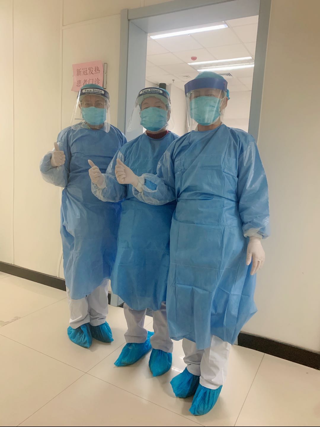 一层橡胶手套,一个防护面屏,一身防护衣,从医护人员通道进入隔离区才进入工作区域,所有的医生全副武装行动都变得不自如,为了节约手套和防护衣,常常6、7个小时都不能喝水、吃饭。且由于呼吸道传播是重要的途径,诊室的门和窗子一直开着,不能开空调,夜班时冷的双脚麻木,长时间带着防护口罩而被压伤的面孔上都是疲惫,可是所有人仍然坚持着,没有一个人喊累叫苦,充分应用平时积累的专业知识及素养,表现出一个医生应有的专业态度,每一位医生都表明了她抗击疫情的决心。