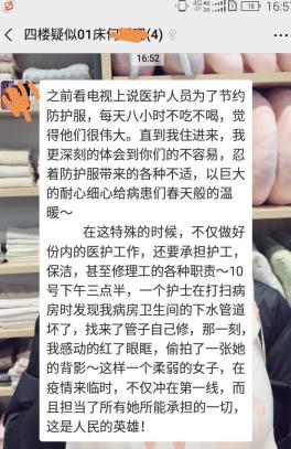春节前夕,医院成立“应急小组”,你立即在科内报了名,你跟我说过:“别说感染科了,就是武汉,只要医院派我去,我就去!护士就是要照顾病人。”2月4日,正在休息的你,接到护理部电话,没有迟疑没有耽误,直接就去了感染科报到,走进了抗疫一线。第一次得知你的消息,还是在医院的官微上,有一张十多位护理姐妹穿着隔离服的合影,你默默的站在最后面。十几天过去了,你没有主动发过一张自己的照片,也从未抱怨过一句。我们只是从护士长处,得知你已参与倒班、进病房护理疑似患者,我们相信你顾不上发朋友圈,肯定是忙着培训、学习、适应新工作岗位。