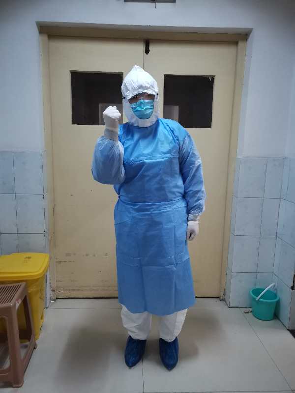 现在已经来隔离病房20多天了,每天里三层外三层,口罩、帽子、防护服、隔离衣、手套一样都不能少,全身上下裹得严实不透气。然后就是做治疗、测血压、测体温、送饭、收垃圾、照顾生活起居等等。身着防护服,患者不知道我们是谁,看不清我们的脸,但他们知道我们是医务人员,我们是为他们奋斗的白衣战士。看到患者们期盼的目光,听到他们在每一次护理操作后的那一句“谢谢……”都让我心里暖暖的。对患者而言,我们真的就是他们唯一的依赖,对于我们,他们百分百信任,我感觉自己责任重大。身穿防护服,几个小时不能喝水不能上厕所,长时间戴口罩的缺氧,脸颊上被压伤的红印,双手浸泡消毒水的裂痕......我觉得都是值得的。