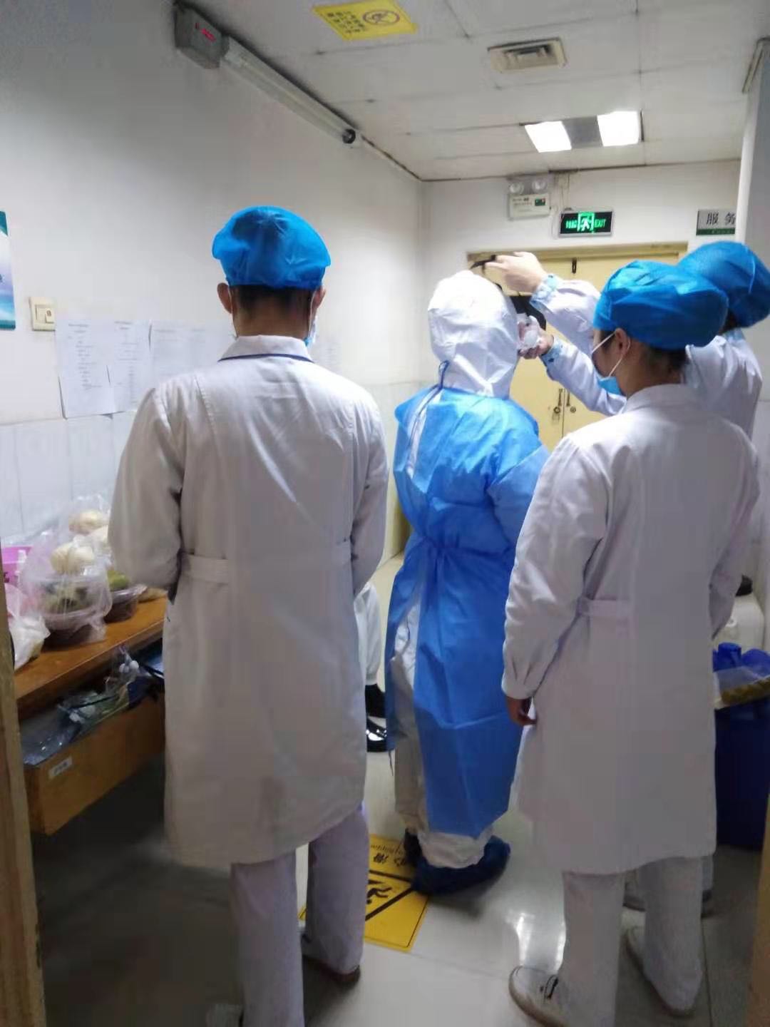 四十五个护理姐妹,从元月25日先后分五批来到新冠隔离病房。我们是2月3日第三批报到的。第一天从熟悉隔离病房环境开始,了解三区两通道划分(“三区”即污染区、半污染区、清洁区,“两通道”即患者通道和工作人员通道)、穿脱防护服、工作方式和流程等内容开始培训。除了以前在专科工作过的护士对三区环境要求掌握外,其她姐妹还不是很清楚,我们几个就帮助她们熟悉。还有几个妹妹我和一样,这个病区是我们曾经工作过的(在新院搬迁以前),所以工作起来会特别顺心,心里不由得有了一丝喜悦。要说我们最感兴趣的还是培训穿脱防护服,轮流穿脱,发现每个人都会提出不同的问题。晚上睡不着想着今天大家提的问题,于是爬起来观看穿脱防护服视频。说实话穿防护服不是很难,只要穿戴整齐不被暴露即可;倒是脱防护服很关键,一不小心就会把病毒带出来。我反复学习反复总结,终于写下适合我们区域的穿脱防护服流程,高兴的我已经忘记时间立即将想法告诉了马护士长,她也很惊讶。第二天我们一起讨论、推敲、反复穿脱、反复培训,最终制定出了符合我们区域的穿脱防护服流程,并即刻执行。