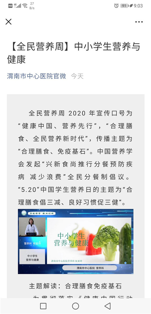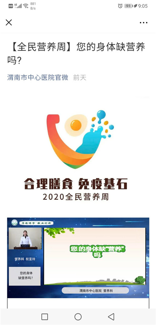 为贯彻落实国务院《健康中国行动(2019-2030年)》《国民营养计划(2017-2030年)》,我院营养科积极响应陕西省营养学及临床营养分会、渭南市卫健委的号召,在5月17日-5月23日全民营养周、5月20日中国学生营养日期间,紧紧围绕活动主题“合理膳食 免疫基石”“合理膳食倡三减、良好习惯促三健”,开展了形式多样的营养科普宣传活动。