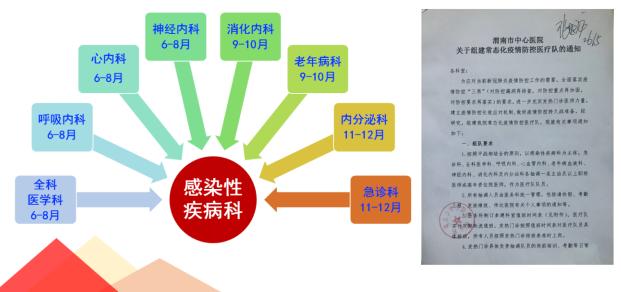 发热门诊是疫情防控的前沿阵地,是“三再”落实诊疗环节重点关注的部位。在排查过程中发现发热门诊医师人力资源紧张、工作负荷较大、缺乏长效应对机制,不符合常态化疫情防控的要求,存在明显漏洞。焦建雄副院长立即组织发热门诊负责人和医务科齐商共讨化解难题,最终以平战结合的原则,统筹兼顾常态化疫情防控和全面提升医疗效率,组建了一支以感染性疾病科医师为主,急诊科、全科医学科、老年病血液科、呼吸内科、神经内科、心血管内科、消化内科及内分泌科医师为辅的常态化疫情防控医疗队,明确组队要求、人员资质、轮值 时间、日常管理等事项,建立了疫情防控长效应对机制,为疫情防控持久战打下了坚实的基础。