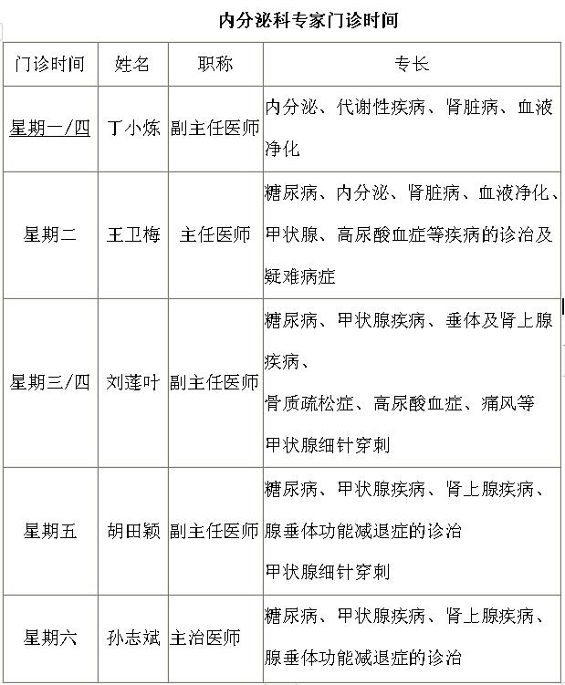 科室诊治范围:糖尿病及各种急慢性并发症、代谢综合征、原发性甲亢、继发性甲亢、原发性甲减、甲旁亢、腺垂体功能减退症、垂体瘤、肢端肥大症、垂体卒中、库欣综合征、醛固酮增多症、嗜铬细胞瘤、高尿酸血症、痛风、甲状腺炎、骨质疏松症等。