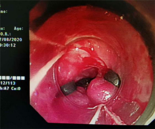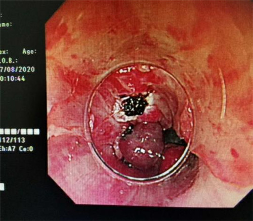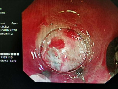 手术中,在镜下发现数条食管静脉曲张延伸至胃底,胃腔内有大量新鲜红色血液及血凝块,寻找到出血部位时仍在向外渗血,血压持续下降,患者时刻有生命危险。曹鹏副主任当机立断对曲张静脉破口处进行组织粘合剂及硬化剂注射,并对曲张静脉进行套扎治疗,在麻醉师陈琦的保驾护航下,整个过程不到半个小时,为患者成功止血,患者转危为安。