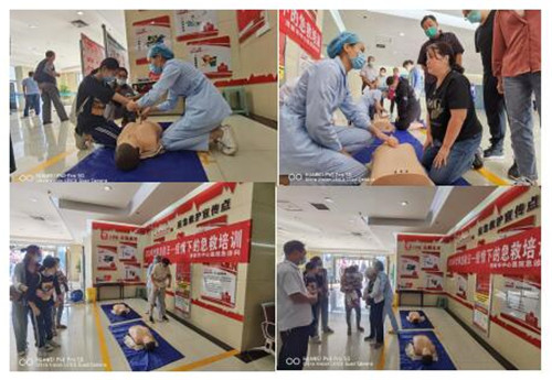 活动现场,通过悬挂横幅,发放宣传资料,实地操作体验,现场指导等多种形式开展,参加活动的主要有门、急诊就诊患者,病陪人等群体。张娟红护士长、董小萍护士现场演示了心肺复苏操作流程及海姆立克急救法,现场群众积极参与。