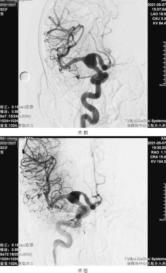 患者男性,32岁,晨起时突发左侧肢体麻木,伴左上肢无力,就诊于市中心医院脑血管病专科门诊。急诊以“急性脑梗塞、颅内动脉瘤”收住市中心医院。入院后行DSA全脑血管造影术提示:右侧颈内动脉末端分叉处巨大夹层动脉瘤。该患者颅内巨大夹层动脉瘤,属于复杂性颅内动脉瘤,累及右侧颈内动脉末端、右侧大脑中动脉、右侧大脑前动脉等主干血管,瘤体较大,不规则,无明显瘤颈,且患者合并高血压等危险因素,动脉瘤破裂风险较高,破裂后的致死率高,故必须进行积极手术治疗。这是选择行颅内动脉瘤介入治疗的指征。但此类颅内巨大夹层动脉瘤采用以往常规的支架辅助动脉瘤栓塞或者其他介入治疗方法,并发症发生率高,术后复发率很高,无法达到预期效果。
